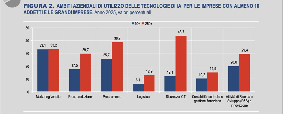 Generalmente, come si evince dal grafico, l'adozione di strumenti AI è cresciuta in tutti gli ambiti aziendali presi in considerazione. Quello del marketing e vendite è però fra quelli in cui l’intelligenza artificiale viene adottata più frequentemente (33,1 per cento). Seguono l’organizzazione dei processi amministrativi (25,7 per cento) e l’area della ricerca e sviluppo o innovazione (20,0 per cento). Si distinguono per l’utilizzo più elevato dell’IA nell’ambito della sicurezza ICT le grandi imprese (43,7 per cento) e quelle di specifici comparti, come le telecomunicazioni (38,4 per cento) e la fornitura di energia (28,2 per cento). In generale, i settori dei servizi postali, delle telecomunicazioni e dell’informatica sono quelli in cui si registra una maggiore varietà degli ambiti aziendali interessati dall’utilizzo delle tecnologie di IA.