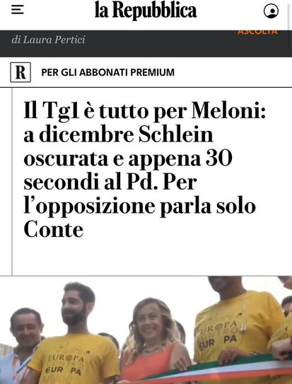 Il quotidiano La Repubblica in un pezzo sul suo sito web di oggi (rimosso ora dall'homepage) sostiene che a dicembre Schlein sia stata oscurata dal Tg1 e siano stati destinati solo 30 secondi al Pd. L'articolo prosegue spiegando che per l’opposizione parla solo Conte “ritenuto più congeniale alla narrazione sovranista”. Sempre Repubblica scrive che “la strategia dei tg pubblici, in particolare del Tg1, è esaltare il leader della maggioranza e soprattutto la premier Meloni e oscurare la sua principale oppositrice Elly Schlein, premiando invece l’altro, ovvero Giuseppe Conte”.