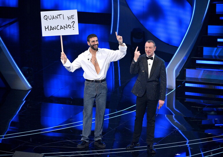 La prima serata della 74esima edizione del Festival di Sanremo si apre con la fanfara dei carabinieri. Quando entra, Amadeus si fa un vistoso segno della croce e va in prima fila a baciare moglie e figlio. Patria, Dio e Famiglia. E in mezzo Mengoni.