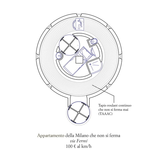 Ma adesso Altissimo/Esposito si concentra sulle “case milanesissime”, e sono piante di appartamenti minuscoli, piante surreali (o iperreali?) di appartamenti immaginari offerti in affitto o in vendita a Milano, come quello con “tapis roulant continuo che non si ferma mai (appunto TAAC”), o la “camera ricavata in intercapedine di facciata”, o la "casa per due ex fidanzati che però vogliono dividersi comunque l'affitto". O ancora la “camera zona Loreto”, che è proprio dentro la metropolitana, “Linea M1, banchina direzione Bisceglie-Rho Fiera, 590 euro al mese più abbonamento Atm”.