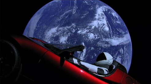 A bordo la Tesla Roadster rossa di Elon Musk con su un manichino