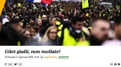 Sulla stampa francese, infatti, decine di titoli parlano del sostegno del "governo populista italiano" alla protesta dei giubbotti gialli contro Macron, con il ministro del Lavoro che dice: "È lo stesso spirito che ha animato il MoVimento 5 Stelle e migliaia di italiani fin dal 4 ottobre del 2009, il giorno della nostra nascita. E da quel momento non ci siamo mai fermati".