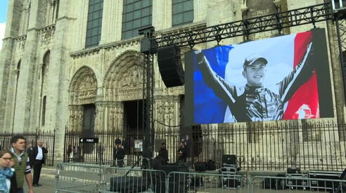 Chartres, 7 set. (askanews) - Una grande bandiera francese con il volto di Antoine Hubert, davanti alla cattedrale del Chartres, per l'ultimo saluto al pilota di Formula 2 morto nell'incidente sul circuito di Spa in Belgio sabato 31 agosto.