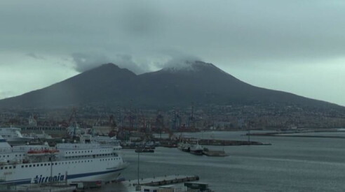 Napoli, il Vesuvio imbiancato fa da sfondo alla città deserta