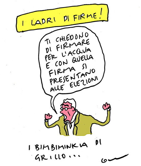 I ladri di firme. Il M5s di Palermo visto da Vincino Vincino 21 nov 2016 x 1 di 4 vincino M5s firme false Sullo stesso argomento: M5s e firme false, gli indagati salgono a tredici. Due parlamentari non rispondono ai magistrati Di più su questi argomenti: vincino M5s firme false